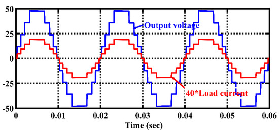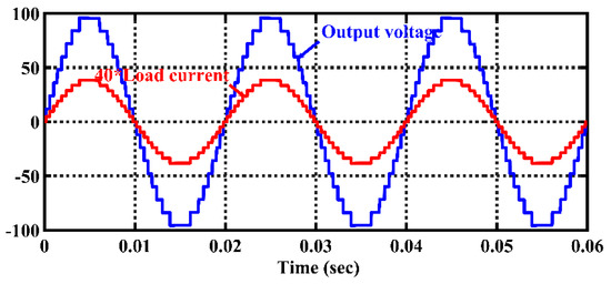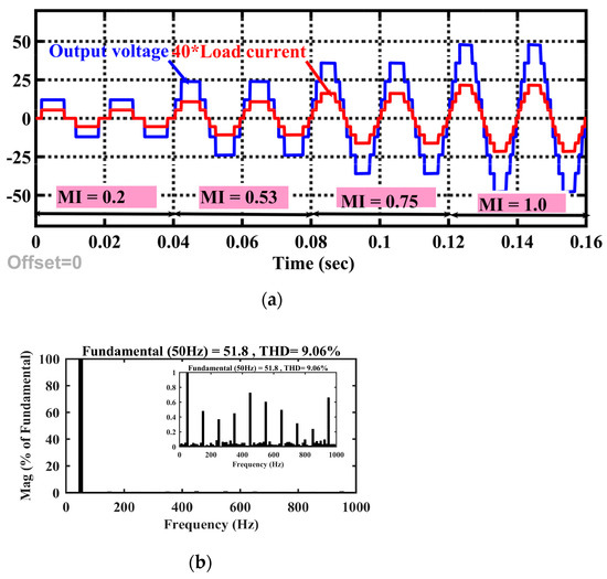 Figure 8 shows the output voltage waveform and load current for the symmetric configuration (9 levels) of the proposed topology under R load for M at unity. Figure 9a shows the output voltage and current for dynamic change in modulation index and Figure 9b shows the total harmonics distortion (THD) in output voltage for symmetric configuration. Figure 10 show the voltage across capacitor C1 (2.5% ripple) and capacitor C2 (2.5% ripple) under the symmetric configuration. Figure 11 shows the waveforms of load current and output voltage for the asymmetric configuration (17 levels) of this topology at M = 1.0 with a purely resistive load. From these figures, it is confirmed that the proposed topology has the capability to generate all positive and negative voltage levels. A gain factor of 40 was taken to multiply the load current in order to have its scale be the same as that of the output voltage. While Figure 12a shows the voltage and current during dynamic change in the load from resistive to resistive-inductive, Figure 12b shows the voltage and current for the asymmetric case for a varying modulation index. THD in output voltage is 9.06% and 4.63% under the symmetric (9 levels) and asymmetric (17 levels) configurations, respectively. Due to the resistive load, the current harmonic spectrum is the same as the load voltage. Figure 13 show the voltage across capacitor C1 (2.5% ripple) and capacitor C2 (2.5% ripple) under the asymmetric configuration.
