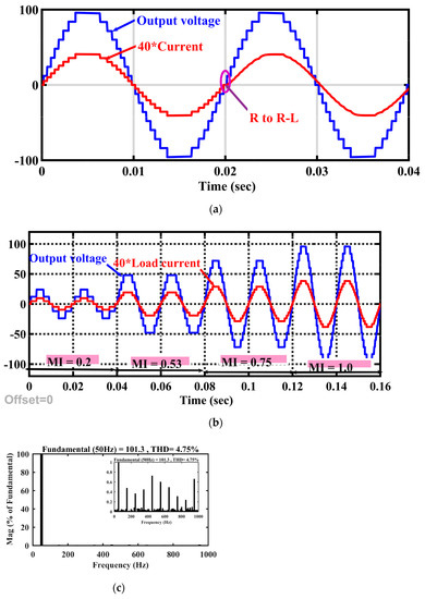 (a) Output voltage and current for change in load from resistive to resistive-inductive, (b) output voltage and current for dynamic change in modulation index, and (c) THD in output voltage for asymmetric configuration.