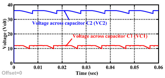 When both DC voltage sources have the same magnitude (V1 = V2), then it is operated in symmetric configuration and produces 9 levels in 0V, V1, (V1 + VC1), (2V1 + VC1), and (2V1 + VC1 + VC2) output voltage waveform, which can be seen from Table 2. From Table 2, it can be observed that more levels are generated when both voltage sources have different magnitudes of voltage, i.e., asymmetric configuration.