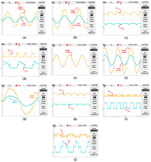 Waveform of (a) output voltage (25 V/div) and load current (1.5 A/div). (b) Output voltage (20 V/div) and load current (0.5 A/div) when the voltage supply of 12 V was connected across both capacitors. (c) Voltage across capacitors C1 and C2 (12 V/div). (d) Blocked voltage across switches S1 and T1 (12 V/div) in symmetric configuration. Waveform of (e) output voltage (60 V/div) under the no-load condition. (f) Output voltage (20 V/div) and load current (0.75 A/div). (g) Output voltage (20 V/div) and load current (0.75 A/div) for showing one complete cycle (h). Voltage across capacitors C1 and C2 (25 V/div). (i) Blocked voltage across switches S1 and S3 (25 V/div). (j) Blocked voltage across switches T1 and T3 (24 V/div) in asymmetric configuration.