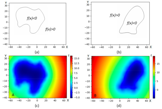 For the signed distance field, the function values of are represented as signed distances. The function value of any point in the mineralized space is defined as the distance from to the closest point on the implicit surface . The points on the surface satisfy . The interior and exterior of the surface can be distinguished based on the sign of function values. Without loss of generality, we make the agreement that the interior of the surface is negative, and the exterior of the surface is positive, as shown in Figure 1.