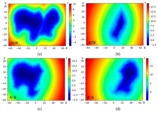 Combination operations of two fields A and B: (a) union operation ; (b) intersection operation ; (c) difference operation ; (d) difference operation . The range of signed distance values corresponds to the color bar.