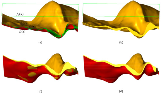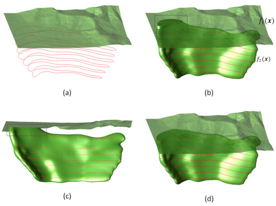 The combination constraints can be used to restrict the implicit surface based on the modeling result of explicit modeling. For example, the signed distance field converted from an explicit mesh can be used to restrict the implicit surface of orebody based on specific distance values. As shown in Figure 3b, without the constraint of topography, the interpolated model (implicit mesh generated by implicit method) may extend above the topography surface (explicit mesh generated by explicit method). A combination constraint is used to ensure an exact fit between the top of the ore body and topography in Figure 3c. The corresponding multi-labeled implicit function is , where represents the topography and represents the orebody. Another combination constraint is used to constrain the interpolated model to 45m below the topography in Figure 3d. In this case, the corresponding multi-labeled implicit function is . It is worth noting that the region above the topography is viewed as the interior of the model, though the topography surface is not closed.