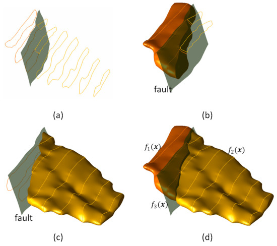 Implicit function fields are generally represented by continuous implicit functions. However, the mineralization space with faults is divided into several discontinuous regions. To consider the influence of faults, the combination constraints can be used to divide the discontinuous mineralization space into several continuous subspaces for interpolation. The interface of fault is interpolated as an independent sub-field, and the interpolation constraints are separated by the interface of fault. As shown in Figure 5, there are three sub-fields, including the fault and two regions divided by the fault. The multi-labeled implicit function of the hanging wall orebody is . The multi-labeled implicit function of the foot wall orebody is , where represents the hanging wall orebody, represents the foot wall orebody and represents the fault. The foot wall of the fault is viewed as the interior of the model though the fault surface is not closed.