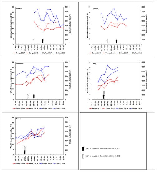 For instance, the harvest period was much earlier in 2018 compared to 2017 in Norway, Poland and Germany, while there were no variations in Italy and France. To highlight the environmental differences between the five growing sites, ambient weekly mean temperature and global radiation during the harvest seasons are shown in Figure 1, starting two weeks prior to start of harvest of the earliest cultivar ‘Clery’. Higher year-on-year variations were observed in Norway. Here, weekly mean temperature was, on average, 3 °C lower, and global radiation 1200 W m−2 less in 2017 compared to 2018 (18 °C and 6412 W m−2). In this year, weekly mean temperature and global radiation in Norway were similar to those in both years in Poland and Germany, and for temperature in France, only. Due to its high altitude (Table 1), Italy exhibited lower weekly mean temperature in both years, thus being similar to Norway in 2017. In Italy, large yearly variations occurred for global radiation in 2017 (5917 W m−2) with similar values as for Norway, Poland and Germany, while in 2018, Italy had the same low values as for both years in France. The low values for global radiation at the southern locations are probably due to the earlier cropping season and shorter photoperiod compared to Norway, as the other extreme.