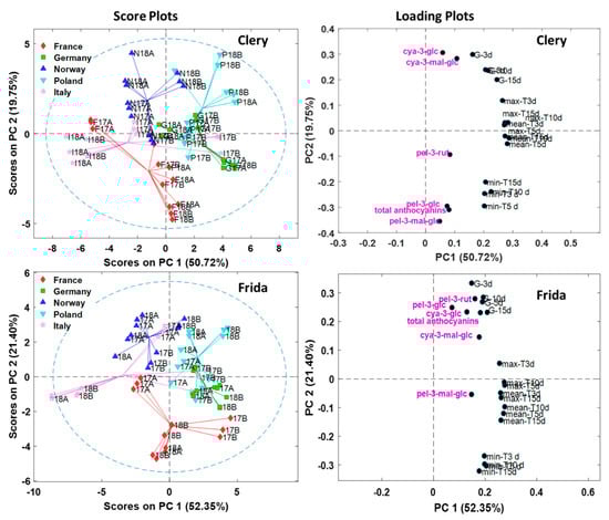 Score and loading plots of PCA for ‘Clery’, and ‘Frida’ grown at five locations (F: France; G: Germany; N: Norway; P: Poland and I: Italy) characterized by total and individual anthocyanin and climatic data. The number and capital letters in the different panel are referring to the year (2017 and 2018, labeled as 17 and 18) and A or B to the harvest date, being one week apart.