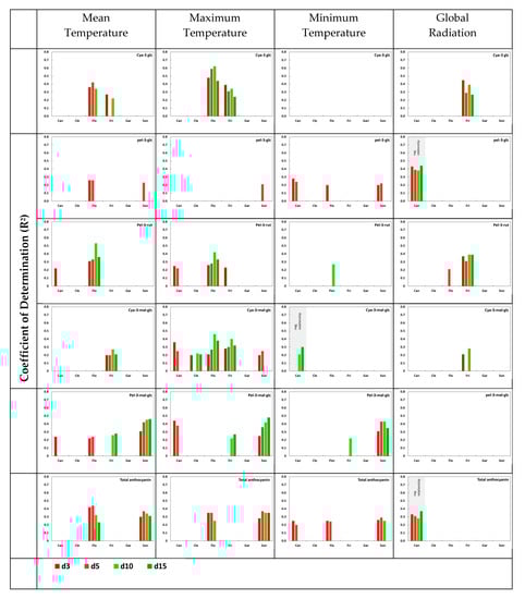 As shown by the PC analysis, the synthesis and accumulation of total and individual anthocyanin were influenced by temperature (Tmean, Tmax and Tmin) and global radiation and its interactions, being altogether affected by the latitude of the growing location. Environmental factors changing with latitude are mainly photoperiod, quantity and spectral composition of the solar radiation [], as well as air temperature being indirectly dependent on solar radiation. However, weather conditions may vary between seasons at site and during the harvest period. Consequently, linear regression analyses were assessed to better explain the dependency of the cultivar-specific anthocyanin synthesis and accumulation on Tmean, Tmax, Tmin and global radiation. Moreover, to evaluate the effective time span of these factors, they were summarized 3, 5, 10 and 15 days prior to harvest. Overall, the percentage of variations (Figure 5), explained by these environmental factors, were rather low with some exceptions (highest R2 = 0.62), highlighting again, the genotype specific- based anthocyanin syntheses. For example ‘Gariguette’ and ‘Clery’, with the exception of cya-3-mal-glc, were not affected by the environmental factors tested. For ‘Clery’, this result supports previous studies showing also no or little environmental effects on anthocyanin accumulation in fruits from this cultivar, when grown at three locations from North to Central Europe [], and at different altitude in Switzerland []. In contrast, ‘Florence’, ‘Frida’ and ‘Sonata’ reacted most sensitively, but differently, to the pre-harvest temperature and global radiation conditions. For these cultivars, in general, (Tmax) had a higher impact on the syntheses of the less abundant anthocyanins cya-3-glc, pel-3-rut, cya-3-mal-glc, pel-3-mal-glc and on the total anthocyanin, than the minimum temperature. Thereby, the influence of Tmax often seemed to be stronger than the related Tmean itself (for example, for the cya-derivates in ‘Florence’ and ‘Frida’). Only the synthesis of pel-3-glc, the main anthocyanin of strawberry, was slightly more influenced by Tmin than by Tmax. In the current study, global radiation was positive correlated with cyl-3-glc and pel-3-rut only in fruits of ‘Frida’.