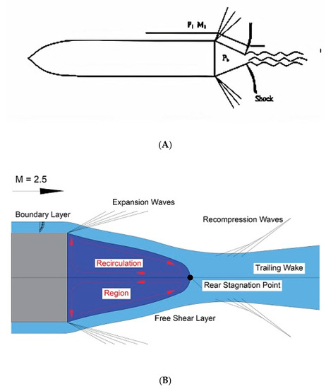 Figure 5A shows the external flow over an artillery shell. Here shock waves are formed at the end of the shell, and expansion waves are formed at its base. Here Pb is the pressure at the base of the shell, and P1M1 is the flow conditions. Figure 5B shows the schematic diagram of external flow over a blunt base. Figure 5C shows the schematic diagram of coherent vortex structures.