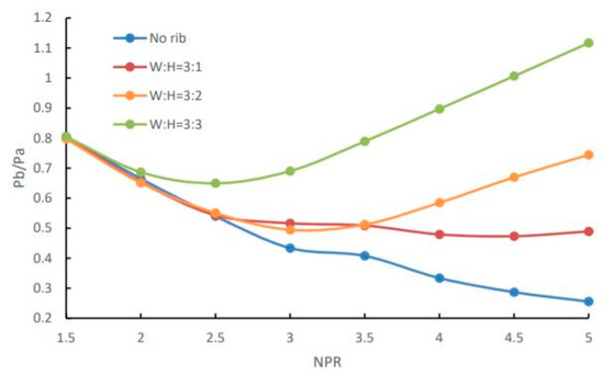 In contrast, with the rib case, the base pressure decreases steadily with aspect ratio 3:1, while for aspect ratio 3:2 and 3:3, it raises the base pressure at NPR 2.5 and 2, respectively. It was also clear that for no rib case, the base pressure decreases continuously, and for rib case 3:1, there is continual decrement of base pressure; however, it is above the base pressure of the smooth pipe. For 3:2 and 3:3, the base pressure starts to increase from NPR 2.5 compared to 3:1, where the base pressure starts to grow right from the beginning, i.e., NPR 1.5. Figure 9 shows the same.