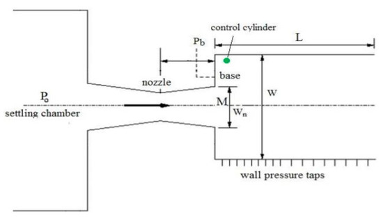 The Mach number has a significant influence on the base pressure and control effectiveness. Figure 6 shows how the multiple cavities are mounted on the duct with nozzle and duct dimensions [6]. The base pressure assumes higher values for higher duct length and Mach numbers (i.e., the drag is reduced, and the control effectiveness is significant). The duct length plays a vital role in the base pressure control, and base pressure assumes high values for low subsonic Mach numbers.