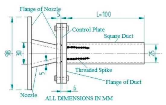 An experimental study was done on the bluff body at subsonic Mach numbers. Passive control in the form of aerospikes was placed on a plate of 1 mm thickness. Two spikes are placed on the plate at 11.5 mm between the nozzle and the duct. The tests were conducted at Mach numbers 0.6, 0.7, 0.8, and 0.9 for an area ratio of 6.25. L/W ratios of the duct taken into consideration are 4, 6, 8, and 10. These experiments were undertaken to control the base drag, an essential component in bluff bodies, to reduce the total drag [21]. Figure 12 below shows the placements of aerospikes.