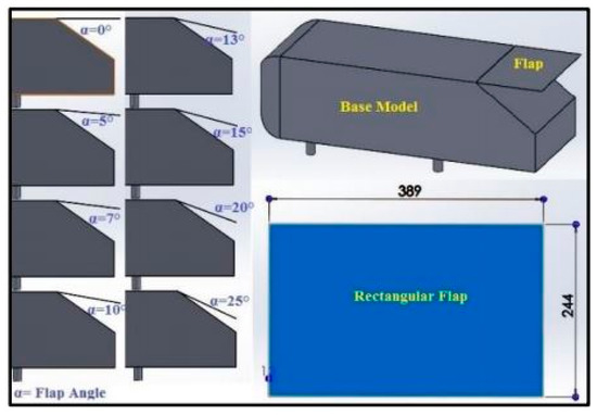 Tian et al. [47] achieved a 21.2% drag reduction at a 25° flap angle on a slant Ahmed body and about 6% at a 35° flap angle on a slant Ahmed body when studying the effect of flaps. In a study motivated by the birds’ secondary feathers when moving deflectors were introduced at 25°slant Ahmed’s body, a maximum drag reduction of 19% was achieved [48]. A study by Altaf et al. [49] introduced three different flap shapes, namely: rectangular, elliptical, and triangular. For the oval flap, a reduced drag of 11.1% was achieved, and 6% was conducted for the rest types of flaps.