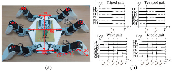Hexapod robot model HexaV4 (a) and gait used in experiments time diagrams (black lines represent leg’s support phase, dashed gap—transfer phase) (b). Leg abbreviations: LF—left front; LM—left middle; LH—left hind; RF—right front; RM—right middle; RH—right hind; T—gait period. All dimensions are in millimeters.