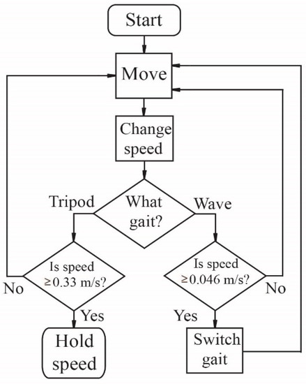 Algorithm for switching between wave and tripod gaits. Wave gait is used when the movement speed is lower than 0.046 m/s; tripod gait is used when the movement speed is higher than 0.046 m/s until the speed reaches a maximum value of 0.33 m/s.