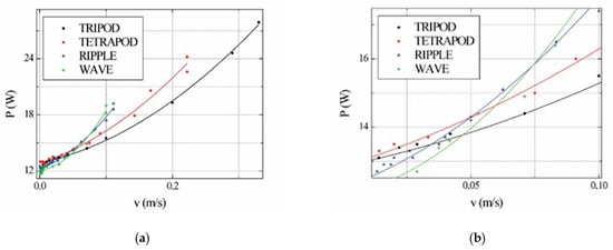 Average power dependence on robot speed and gaits: (a) normal view, (b) enlarged view. Experiments were carried out without additional load on the robot. Each dot represents a separate experiment with a certain configuration. Lines show polynomial approximation. No gait type switching was used.