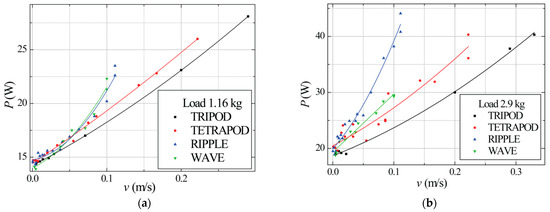 To make sure that the recurrence is stable and does not change depending on conditions, we repeated the experiment with 1.16 kg and 2.9 kg loads placed on the top of the robot. Results are shown in Figure 4. All curves for different gaits with 1.16 kg load were arranged in the same way as with no load. The point of gait switching decreased (v = 0.028 m/s). Only with a 2.9 kg load does the arrangement of curves start to change. This shows that energy consumption depends on the robot’s weight. With increased robot’s weight, gait switching speed decreases, i.e., the tripod gait becomes more effective at slower speeds with increased load.
