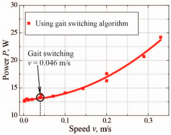 By calculating the average current for each interval, we managed to obtain power consumption dependence on the speed of a full program run with a gait switching algorithm. We can see from Figure 7 that power consumption changes from ~12 W to ~24 W. The same results and curve form can be seen in Figure 3, where each result was obtained by a separate experiment. This demonstrates that our proposed method leads to power consumption minimization.