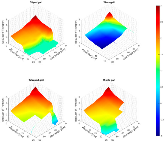 Comparison of Cost of Transport upon gait type, gait step length, and resolution.