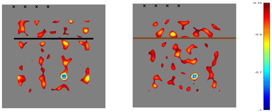 Color maps of the topological sensitivity along a rectangular interrogation window in a rectangular Aluminium plate containing a through slit (indicated with a horizontal black line in the left plot) and a through inclusion of Titanium (indicated with a horizontal brown line in the middle plot); both plots share the color scale for the topological derivative, given in the right plot. In both cases, four dual emitters/receivers are considered, in which their positions are indicated with black x symbols, and the actual position of the defect indicated by a white + symbol. As can be seen, the method identifies well the position of the defect at the blue (negative) peak of the topological sensitivity. Courtesy of Dr. Anxo Martinez.