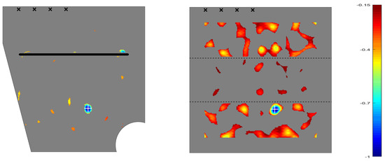 Let us now consider the topological sensitivity approach for post-processing SHM data obtained via infrared (IR) active thermographic inspection. A topological sensitivity-based analysis using steady thermography was presented by us in Reference [81] (see Reference [82] for a preliminary theoretical analysis using steady thermograms, and also Reference [83] for an analysis using oscillatory, multifrequency, and thermograms) and had been already considered by other authors in References [84,85].