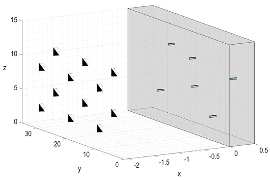 Results will be given on steady IR thermographic inspection using twelve lamps contained in a plane, parallel to the cross section of the plate, in a Cartesian coordinate system (see Figure 3). These twelve lamps steadily illuminate, one after another (waiting for the plate reaching a steady state each time), on one side of the plate. Twelve thermograms capture the temperature distribution at the same side of the plate, after the steady state is reached each time. Thus, the number of available data is increased in a way similar to that developed in Reference [79].