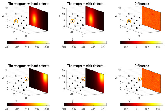 The thermograms obtained for two positions of the lamp (left and middle plots), as obtained in the clean plate (without defects) and in the plate with internal defects. The difference between both thermograms is also given in the right plots. In each plot, the active lamp is represented by an orange circle.