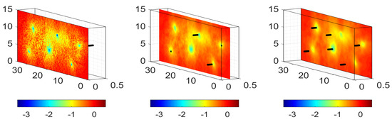 Color maps for the sections of the topological sensitivity with the planes (left), (middle), and (right). The actual positions of the defects are shown by the six elongated black boxes. Negative peaks of the topological sensitivity coincide with defects positions.
