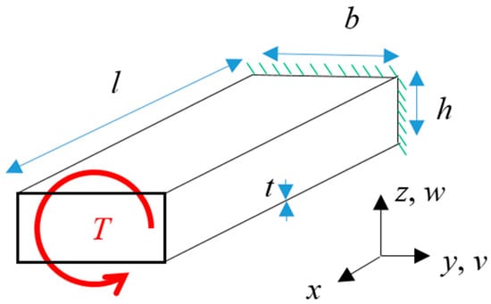 To use a rectangular thin-walled pipe as a wing spar, a buckling analysis using the energy method was conducted on the cantilevered rectangular pipe under torque T shown in Figure 2. The rectangular pipe consisted of two vertical plates and two horizontal plates. The vertical and horizontal plates were assumed to be simply supported. The out-plane displacements v and w are described as follows: