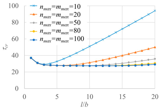 The error of mmax = nmax = 20 is within 1% of mmax = nmax = 100 for l/b ≤ 6, and the buckling stress τcr is constant for l/b > 6 because of effect of boundary constraints at x = 0 and x = l vanishing; thus, mmax = nmax = 20 for l/b ≤ 6 and buckling stress τcr (l/b = 6) for l/b > 6 were used in the subsequent numerical calculations.