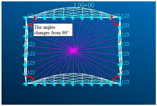To check the assumption of a constant edge angle, an FE analysis was conducted using NASTRAN (version2018.1). The dimensions of the pipe were b = h = 100 mm, t = 1 mm, and l = 400 mm. A square mesh with a size of 10 was used. A rigid body element (RBE2) connected the end of the plates to the center of the section and torsional load (torque) was applied to the center of the section. Figure 5 shows the buckling mode and the changes in the angles of the pipe from 90°.