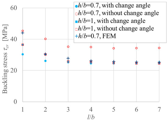 The numerical results for Equations (18) and (26), and FEM for h/b = 0.7 are shown in Figure 6. The results for Equations (18) and (26) for h/b = 1.0 are also plotted for comparison. In the case of l/b = 1, the FEM result of h/b = 0.7 is close to the constant-angle case; however, in the region l/b ≥ 2, the FEM result of h/b = 0.7 is close to the variable-angle case. There are no apparent differences between the results of Equation (18) for h/b = 1.0 and those of Equation (26) for h/b = 1.0 because of the section is rectangular and thus the edge angle is constant. These results show that the assumption of a constant edge angle is a stiff constraint for the region h/b < 1.0. Thus, the assumption of a variable edge angle, Equation (26), was employed in the subsequent analysis because of its more accurate and safe-side estimation. Note that both FE analysis and the method of minimizing the total potential energy are essentially the same because they are based on energy principle. If the difference appears, the reason is convergence due to mesh size of FE model or number of terms of displacement function of Equations (1) and (2). The convergence is discussed in Section 2.2 and Figure 4 and Figure 6 shows the present results gives conservative result comparing with FE results, thus the accuracy of the solution is reliable.