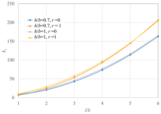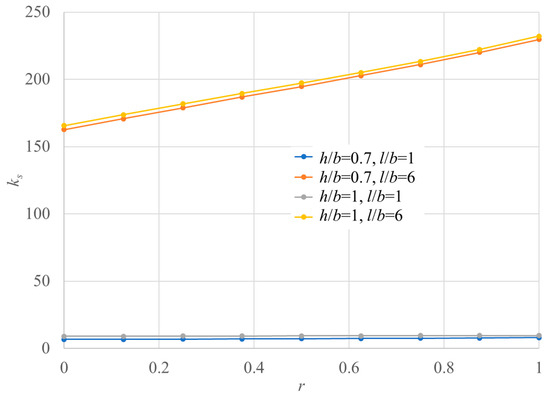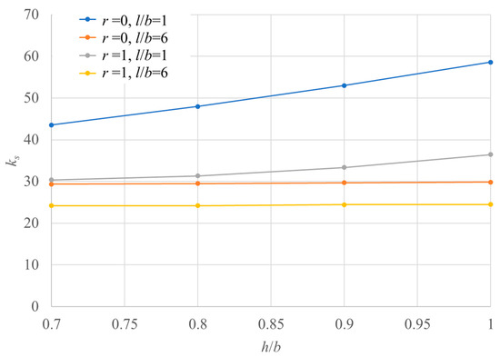 Assuming that the number of layups was large enough, the bending stiffness was calculated as Eij t3/12 = Dij (i, j = x, y, s). Advanced stiffness properties like through thickness properties discussed in Refs. [19,20,21] are not used because of to make quick and convenient estimates. Figure 7, Figure 8 and Figure 9 show the buckling load factor ks for l/b, h/b, and r. The ranges of l/b, h/b, and r are 1 ≤ l/b ≤ 6, 0.7 ≤ h/b ≤ 1, and 0 ≤ r ≤ 1.