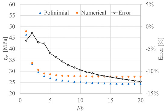 Figure 10 compares the buckling stress determined by the polynomial equation and the numerical result for mmax = nmax = 100 for the maximum ks-er error case (r = 0.5, b = l = 100 mm, t = 1 mm). The error is also plotted. The error in the region l/b > 6 is around −11%, which gives a safe and conservative side for the design. It is natural that constant gap appears in the region l/b > 6 because ks does not change in the region l/b > 6 and the constant ks’ at l/b = 6 is used. Note that the polynomial equation can be used within the ranges of 1 ≤ l/b ≤ 6, 0.7 ≤ h/b ≤ 1, and 0 ≤ r ≤ 1.