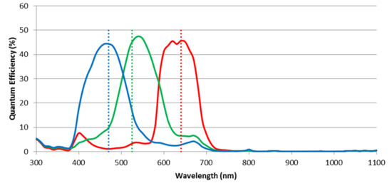 Color cameras are divided into single-chip color cameras and three-chip color cameras. A color camera has red, green, and blue color channels. The single-chip color camera uses a Bayer filter to show one of the three colors, and the camera’ processing unit performs spatial color interpolation to obtain the other two colors. The three-chip color camera has three semiconductor devices, each of which corresponds to a primary color. A prism can separate the primary colors of received light. The first type is significantly cheaper, and the second one provides better-quality captured color images [15]. It is common that in color cameras, the spectra of red, green, and blue channels are always made to overlap so that there are no color-blind regions in the spectrum [16]. But the overlaps between different color channels are not alike. Generally speaking, the overlaps between the green channel and the other two channels are serious. Red and blue channels have very little color crosstalk. We used a single-chip color camera; its spectral response curve is shown in Figure 1. In our projector, the wavelength of blue LEDs was 459nm, and that of the red LEDs was 618nm. Figure 1 shows that the quantum efficiency of the red channel, at 459nm, and that of the blue channel, at 618nm, were very low. This means that the red and blue superimposed fringe patterns can be separated well.