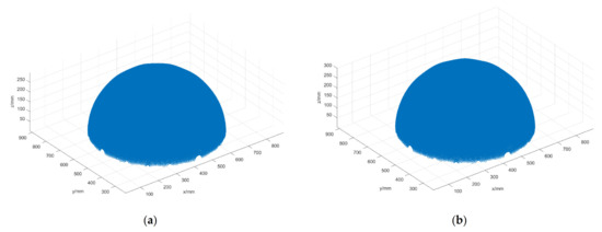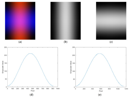 Using Equations (2) and (3), we unwrapped the wrapped phase. As shown in Figure 5 and Figure 6, the wrapped phase was unwrapped as an absolute phase successfully, and the cross profiles had good linearity. The simulation results revealed that color cross-talk between the red and blue channels did not affect the phase. We then simulated the three-dimensional measurement. The measured object was a hemisphere with a radius of 300 mm, as shown in Figure 7, and the spatial scale of the image was set to 1 mm/pixel. Figure 8 shows the simulation of the phase image captured by the camera, where (a) is the low-frequency phase-shifting image, and (b) is the high-frequency phase-shifting image, and they were all added color crosstalk. Based on the proposed method, we acquired the measurement results from the left (red) and right (blue) projection. We then fit the hemisphere with 3D data.