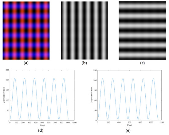 , and represent the images of three channels, respectively. and indicate the red and blue stripes we projected. is the response coefficient of the red channel to the red projection. is the response coefficient of the red channel to the blue projection. is the response coefficient of the green channel to the red projection. is the response coefficient of the green channel to the blue projection. is the response coefficient of the blue channel to the red projection. is the response coefficient of the blue channel to the blue projection. We set and as 0.8; as 0.2; and , and as 0.03. The red fringe was vertical and the blue fringe was horizontal so they could be easily distinguished. Figure 3 and Figure 4 show the results. The images measured 1140 × 912 pixels, which is consistent with the resolution of the projector we used.