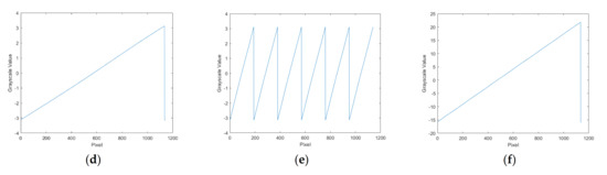 Red-channel image phase unwrapping: (a) low-frequency wrapped phase; (b) high-frequency wrapped phase; (c) unwrapped phase; (d) cross profile of (a); (e) cross profile of (b); (f) cross profile of (c).