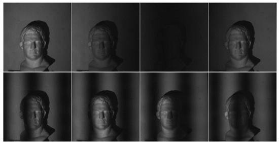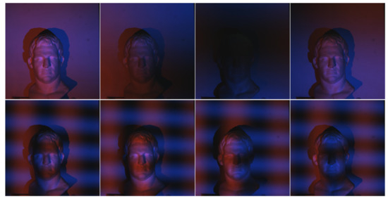In Figure 11, the upper pictures are low-frequency, and the bottom ones are high-frequency. By separating different color channels, we obtained 16 pictures of high and low frequency fringes using the double projectors (Figure 12 and Figure 13). According to Equations (2) and (3), we unwrapped the wrapped phase. The unwrapped phases are shown in Figure 14 and Figure 15.