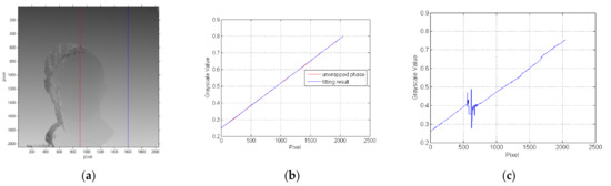 As shown in Figure 14a and Figure 15a, the red and blue channel pictures were used to unwrap the phase directly, with good-quality results. The blue lines in Figure 14a and Figure 15a, are the background parts, and we made a linear fit to their cross profiles, as shown in Figure 14b and Figure 15b. R-square represents the goodness of fit. The R-square in Figure 14b was 0.9992, and in Figure 15b it was 1, demonstrating excellent linearity. The red ones are cross profiles of the measured object that have fluctuations, and the disorder areas are shadows. The background and the measured object both had a fine unwrapped phase. In the double-projector structured-light three-dimensional measurement system, the two projectors projected red and blue stripes, respectively, and the superimposed grating was separated simply without a complicated coding mode or separation algorithm. The separation results can be directly used in phase unwrapping and subsequent processing without other filtering operations.