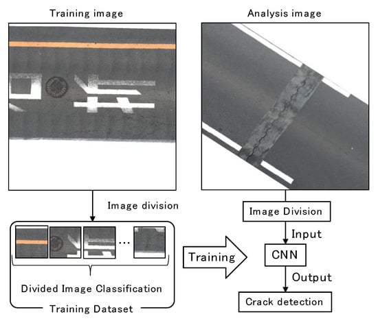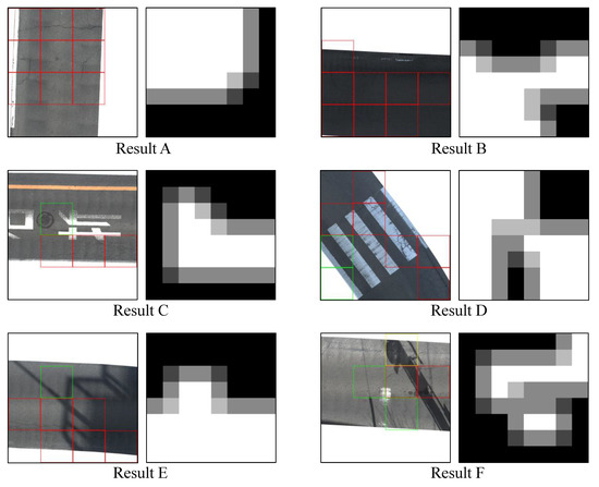 Figure 5. It would be much easier and simpler if we could classify the output with the mere presence/absence of cracks. The result of our initial analysis, however, included false detections in images, where road markings or utility holes were detected as cracks. We, therefore, set six classes as shown in