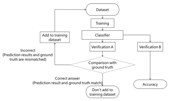 Figure 6. First, we perform training on a small randomly selected training data set. This is the initial model. We then let the model classify the new data not used for training (Verification A). Then, after the analysis in verification A is performed, images that could not be properly classified are added to the training dataset. The above flow is considered to be one cycle, and this cycle is repeated. In addition to the data to be added to the training data (the data used for verification A), we also prepare data for calculating the accuracy of the model (verification B). Then, when the accuracy converges, the repetition is stopped. In this study, we decided to stop when the accuracy did not improve for three consecutive cycles.