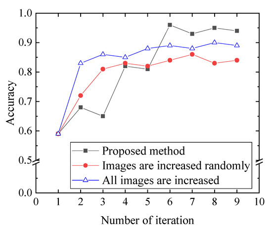Figure 8. It is clear from the figure that although the accuracy is inferior at the beginning, it is superior at the end. This may be due to the fact that the classifier is confused at the initial stage of adding difficult data, but gradually stabilizes. For comparison,