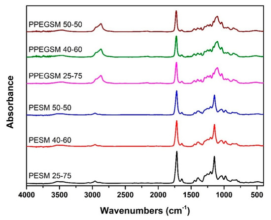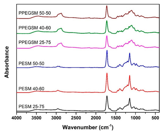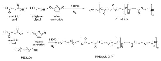 Six unsaturated polyester resins of high biobased content—up to 78%—were successfully prepared by a direct esterification of SA and MA with the respective diols, such as ethylene glycol and PEG200. The polyesters were named PESM X-Y and PPEGSM X-Y, respectively, where X stands for the mol% of SA and Y for the mol% of MA contained in the resin. The synthesis of the resins is presented in Figure 1. After preliminary studies it was found that the best esterification temperature was 180 °C under nitrogen flow.