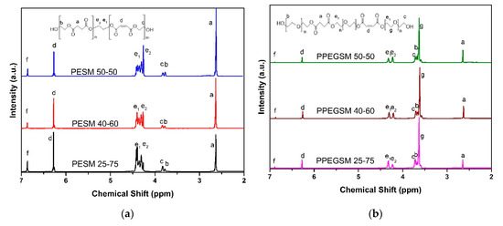 The structure of the produced resins was examined by means of 1H NMR. The collected spectra are presented in Figure 2. The “a” protons from the methylene groups of succinic acid were visible at 2.63 ppm. Following the ring opening of maleic anhydride, maleic acid was the main unsaturated acid incorporated into the resins’ backbone, and the protons of the double bond appeared at 6.26 ppm, marked as “d.” Nevertheless, some isomerization from maleic to fumaric acid also took place, as the signal at 6.85 ppm clearly shows (“f” protons, not shown in the inset scheme) [30]. An example of integration of the signals can be found in Figure S2. As the acid-to-diol ratio in the synthesis protocol was 1:1.25, free –OH terminal groups were also visible that were derived from monoesterified diols. Free –OH groups of EG near the succinic acid appeared at 3.77 ppm—the protons marked “b,”—whereas those near the unsaturated acid appeared at 3.82 ppm—the protons marked “c” in Figure 2a. For the resins containing PEG200, a new signal appeared in the spectra. The signal came from protons marked “g” in the inset scheme, near the ether bond of PEG200, and appeared at 3.61 ppm. For the protons of the methyl groups near the ester bonds, the “e1” protons near the unsaturated acid appeared at 4.31 ppm and the “e2” protons near the succinic acid appeared at 4.2 ppm, shown in Figure 2b. Finally, the protons of free –OH groups, derived from monoesterified PEG200, appeared at 3.71 ppm when close to the unsaturated acid and at 3.66 ppm when near succinic acid (protons “b” and “c” in Figure 2b, respectively).