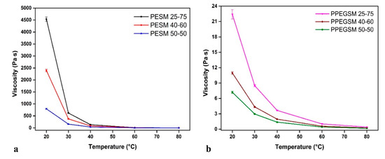 Viscosity of the synthesized resins (a) containing EG, (b) containing PEG200 as a function of temperature.