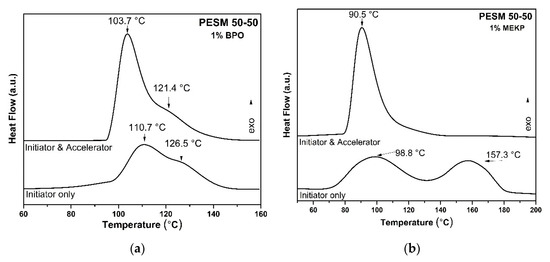 From the above studies it was proven that UPR resins were successfully prepared and should be further cross-linked using AA in the presence of different initiators and accelerators. In order to better understand the curing procedure, DSC investigation was implemented. Typically, the two most frequently chosen initiators for thermal-induced cross-linking are BPO and MEKP, with their main difference being the temperature of homolytic dissociation [38,39]. For the measurements, UPRs were mixed with AA at a 2:1 ratio, as well as the respective initiator, along with 1% Co(II) octoate, which served as the accelerator [40]. In Figure 5, the influence of the accelerator and both the two initiators is presented, regarding the thermal curing evaluation of the UPRs by means of DSC measurements, using the PESM 50-50 resin as representative. The strong influence of the initiator type was noticed in the curing process, as is shown by the two thermographs of Figure 5 with the indication “Initiator only.” The cross-linking of the resins presented two exothermic peaks with maxima at 110.9 and 126.5 °C when using BPO, and at 98.8 and 157.3 °C when using MEKP as the initiator. These two exothermic peaks show that the cross-linking is a two-stage reaction, as also reported for the cross-linking of UPRs with the use of accelerator and initiator in previous studies [41,42,43]. These two stages are attributed either to redox decomposition of the initiator initially, followed by its thermal decomposition [41,44], or to the radical copolymerization of AA with the resin followed by the radical homopolymerization of AA [45,46]. Nevertheless, the attribution of these two peaks is a matter still under consideration [40]. After the addition of the accelerator, the two stages of cross-linking using BPO (Figure 5a) were shifted to 103.7 and 121.4 °C, whereas in the case of MEKP (Figure 5b) the two stages were difficult to separate, as the first stage at 90.5 °C was the dominant one.