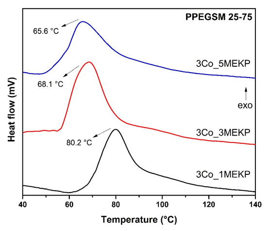 The influence of the amounts of both the accelerator and the initiator were examined. In Figure 6, the curing of PPEGSM 25-75 is presented, with the use of 3 wt% Co(II) octoate. Once again, the cross-linking was described as a two-stage reaction. The radical copolymerization of AA with the UPR was initiated at 61, 55, and 48 °C for the three different amounts of MEKP, with exothermic peak maxima at 80, 68, and 66 °C, respectively, showing that the temperature dependence of the reaction with the initiator stabilized after the use of 3 wt% of MEKP.