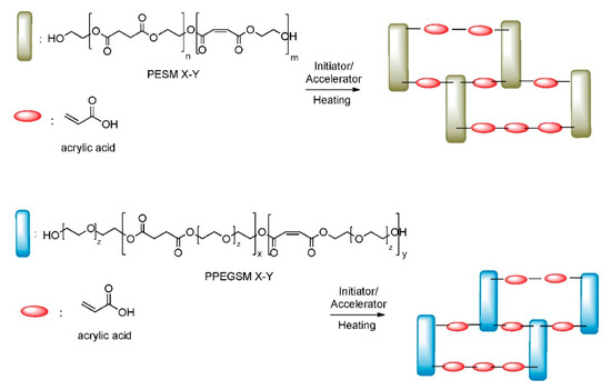 Succinic acid (SA, purum 99+%), maleic anhydride (MA, purum 99%), ethylene glycol (EG, purum 99+%), poly(ethylene glycol) molecular weight (M.W.):200 (PEG200, 99%), acrylic acid (AA, purum 99%) and 2,6-di-tert-butyl-4-methylphenol (BHT, 99%) were purchased from Alfa Aesar, Kandel, Germany. Methylethylketone peroxide (MEKP), benzoyl peroxide (BPO), and cobalt(II) octoate were purchased from Merck, Darmstadt, Germany. FASCAT 4101 catalyst was kindly donated by PMC Organometallix, through Safic Alcan HELLAS SA, Athens, Greece. Solvents were reagent or analytical grade and were purchased from Aldrich, Steinheim, Germany. All reagents were used without further purification.