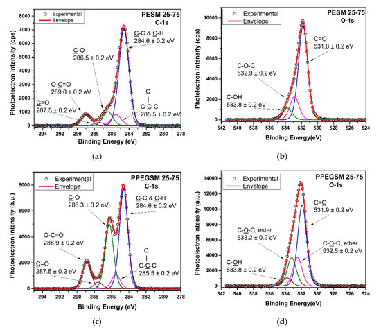 In the case of the O–1s spectra of both the cross-linked experimental resins, their curve-fitting was performed conservatively, as there were expected participations of the same bonds attributed to different monomers. In this direction, the curve-fitting of the O–1s high-resolution core level spectrum of PESM 25–75 (Figure 9b) resulted in three separate peaks: at 531.8 eV of ester and carboxylic C=O bonds, at 532.9 of ester C–O–C bonds, and finally, at 533.8 eV, attributed to carboxylic C–OH bonds [53,55,58,59]. Similarly for the PPEGSM 25–75 (Figure 9d), the same attributions applied for the peaks at 531.9, 533.2, and 533.8 eV, with an additional peak at 532.5 eV because of the additional ether C–O–C bonds of PEG [53,58].
