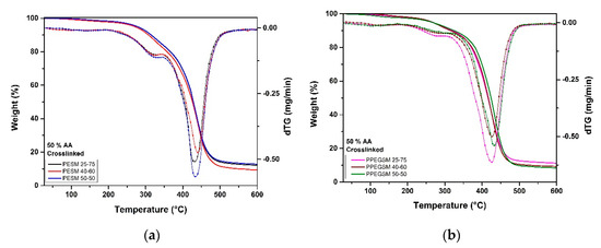 Thermogravimetric curves (weight loss and dTG) of the cross-linked PESM (a) and PPEGSM (b) resins.